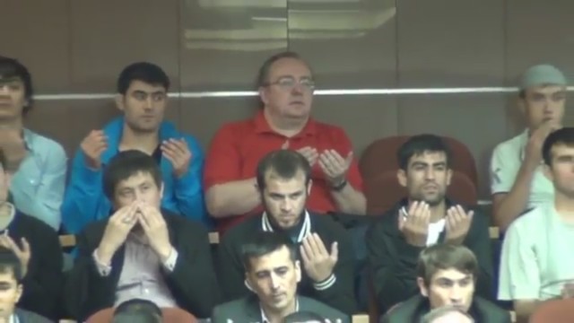 В красной майке сотрудник правозащитного центра «Мемориал» Виталий Понамарев вместе с другими участниками конференции «Хизб ут-Тахрир» совершает молитвенное обращение к Аллаху.